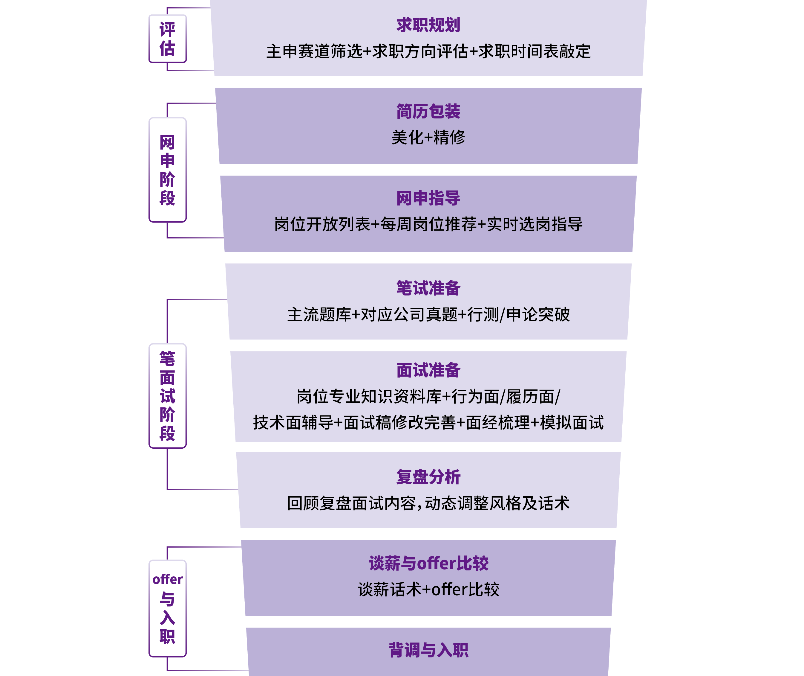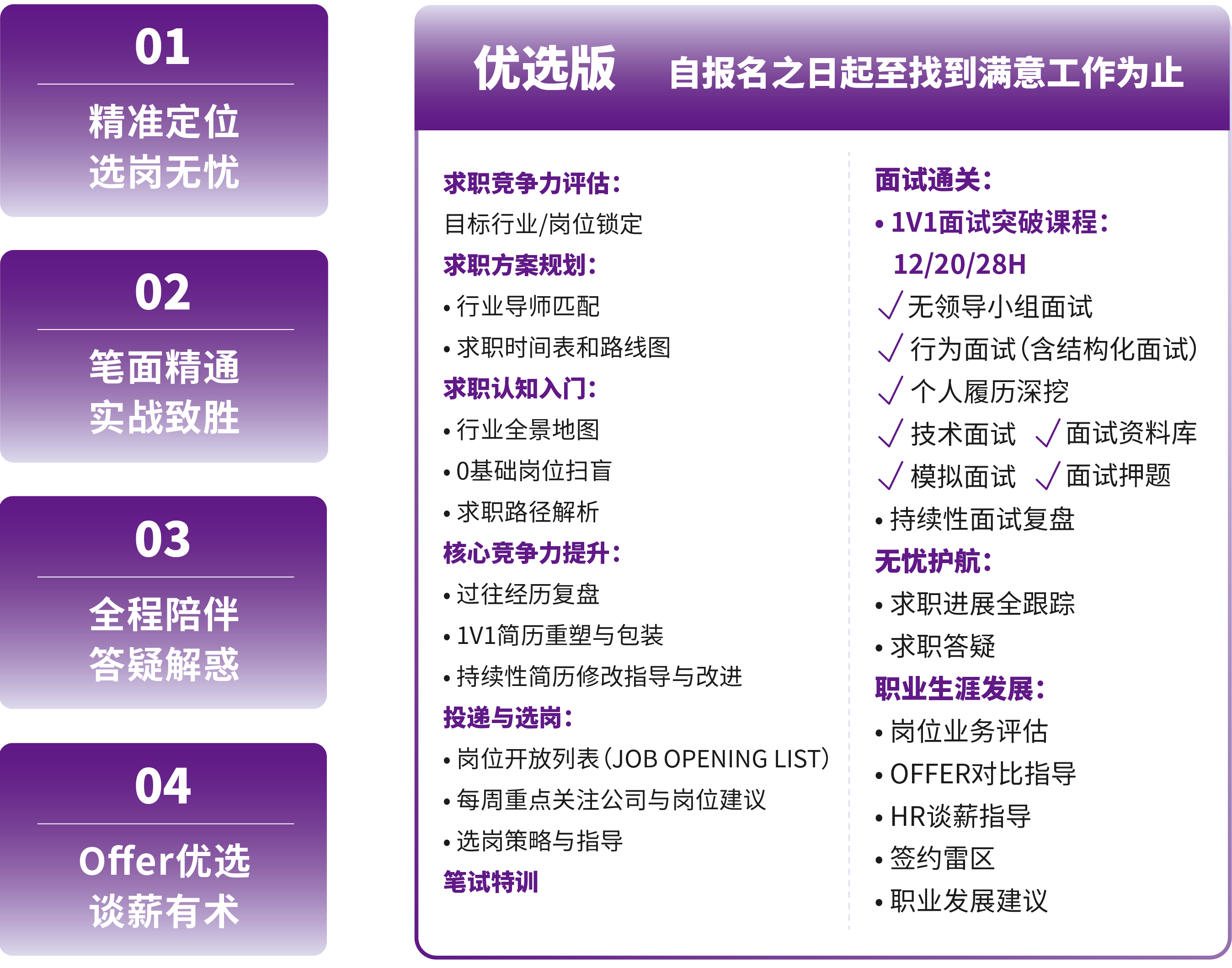 首创矩阵式求职和模块化面试,提供“求职规划-投递选岗-履历包装-笔试突破-面试辅导-谈薪入职”的一站式求职咨询服务。